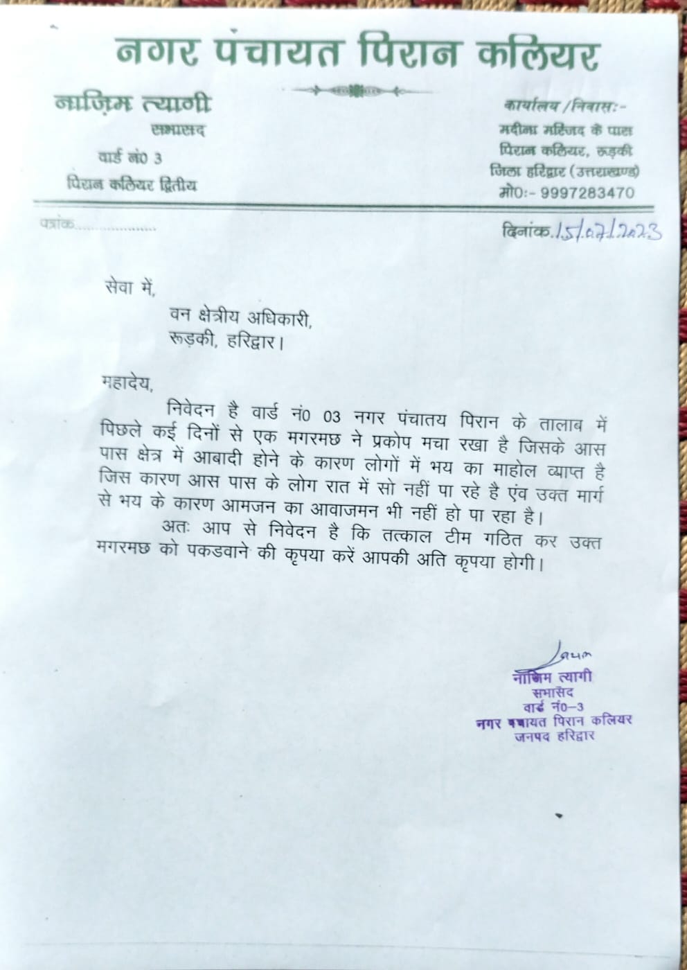 वार्ड 3 के कर्मठ सभासद नाजिम त्यागी ने तालाब से मगरमछ पकड़ने को वनक्षेत्रीय अधिकारी को दिया ज्ञापन,,,