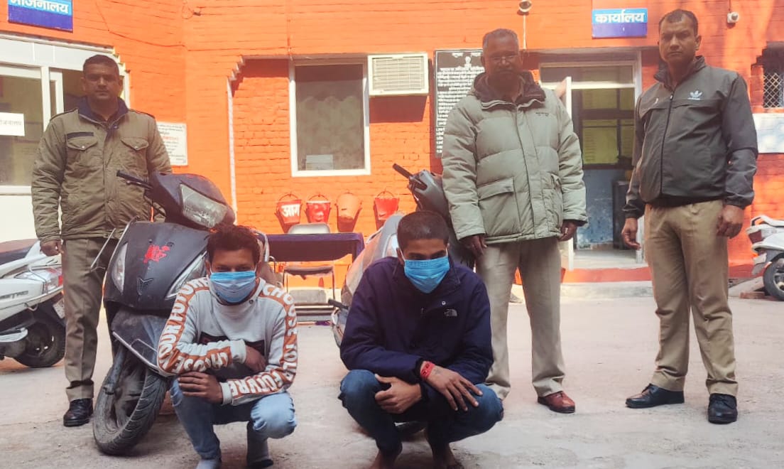 बढ़ती वाहन चोरी की घटनाओं पर अंकुश लगाने के लिए पुलिस कप्तान प्रमेन्द्र डोबाल के निर्देश पर जनपद’भर में बड़ा अभियान चलाया जा रहा है। इसी कड़ी में नगर कोतवाली प्रभारी कुंदन सिंह राणा के नेतृत्व में पुलिस टीम का गठन किया गया है। वाहन चोरों को पकड़ने के लिए पुलिस टीम लगातार चेकिंग अभियान चला रही है। ब्रस्पतिवार को चेकिंग के दौरान पुलिस टीम ने रानीपुर मोड़ अंदर पास से दो सन्दिग्ध सागर पुत्र सुनील कुमार व शिवम मिश्रा पुत्र राजेन्द्र मिश्रा निवासीगण ब्रह्मपुरी हरिद्वार को चोरी की दो स्कूटी के साथ गिरफ्तार कर लिया। पूछताछ में एक स्कूटी हरिद्वार व दूसरी ज्वालापुर कोतवाली क्षेत्र से चोरी करने प्रकाश में आया। जिस संबंध में दोनो कोतवालियों में अभियोग दर्ज है। कोतवाली प्रभारी कुंदन सिंह राणा ने बताया आरोपी नशे की लत पूरी करने व दैनिक आजीविका चलाने के लिए चोरी करते थे, दोनो चोरों को न्यायालय में पेश करने के बाद जेल भेज दिया गया। पुलिस टीम में उपनिरीक्षक नरेंद्र सिंह रावत, कांस्टेबल जसवंत बिष्ट, सौरभ नौटियाल व अमित भट्ट शामिल रहे।
