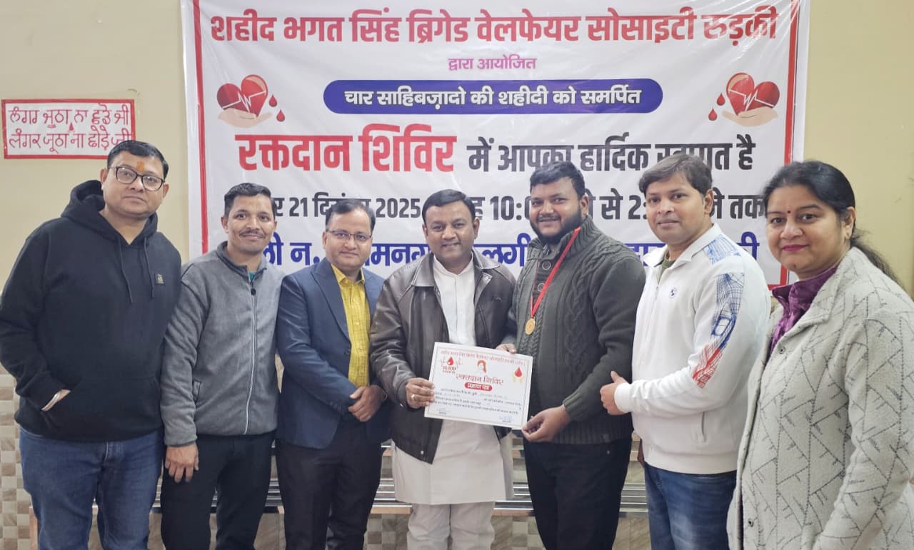 शहीद भगत सिंह ब्रिगेड वेलफेयर सोसाइटी द्वारा रामनगर स्थित गुरुद्वारे में रक्तदान शिविर का आयोजन किया गया,जिसमें बड़ी संख्या में रक्तदाताओं ने भाग लिया।शिविर में मुख्य अतिथि के रूप में पहुंचे एसपी देहात शेखर चंद सुयाल ने संगठन के सामाजिक कार्यों की सराहना करते हुए इसे जनहित में किया गया महान कार्य बताया।उन्होंने कहा कि रक्तदान का कार्य बड़ा पुण्य का कार्य है।उन्होंने रक्त वीरों को शुभकामनाएं दी।पूर्व मेयर गौरव गोयल ने रक्तदान करने वालों को बधाई देते हुए कहा कि यह कार्य बड़ा ही पुनीत कार्य है और इससे जरूरतमंद लोगों को समय पर रक्त की आवश्यकता की पूर्ति होती है,जिससे किसी की जान बचाई जा सकती है।संस्था के अध्यक्ष गौरव कुमार ने बताया कि थैलेसीमिया से पीड़ित बच्चों के लिए सरकार की ओर से फ्री ऑफ कॉस्ट ब्लड दिया जाता है,इसलिए हमारी संस्था साल में दो बार रक्तदान शिविर का आयोजन करती है।रक्तदान महादान है और ऐसा करने से हम अनेकों बच्चों को जीवन बचा सकते हैं।संस्था के सतनाम सिंह व अमनदीप ने कहा की शहीदी पर्व की शुरुआत पर हम प्रतिवर्ष रक्तदान शिविर करते हैं।गुरु गोविंद सिंह के चार साहबजादे की याद में यह शिविर लगाया जाता है।संगठन सचिव शिल्पी सिंह ने कहा कि प्रत्येक व्यक्ति को हर तीन महीने में रक्तदान करना चाहिए,इससे किसी को जीवन तो मिलेगा ही साथ ही हमें पता भी चल जाता है कि शरीर में कोई रोग तो नहीं है।इस मौके पर राजेश तिवारी,अजीत सिंह,अनुज शर्मा, अमनदीप सिंह,राजीव चौधरी, अनिकेत पाल,अंकित कुमार,दीपा,सन्नी,सिमरनजीत सिंह,हिमानी,रजनी तथा निखिल सेठी आदि प्रमुख रूप से मौजूद रहे।अतिथियों द्वारा रक्तवीरों को सम्मान पत्र देकर उनका उत्साह वर्धन किया गया।